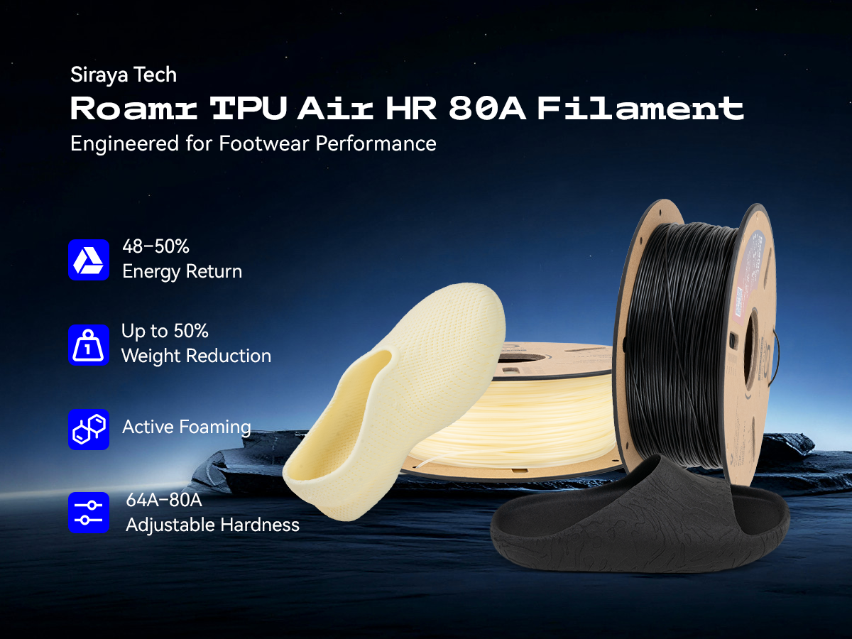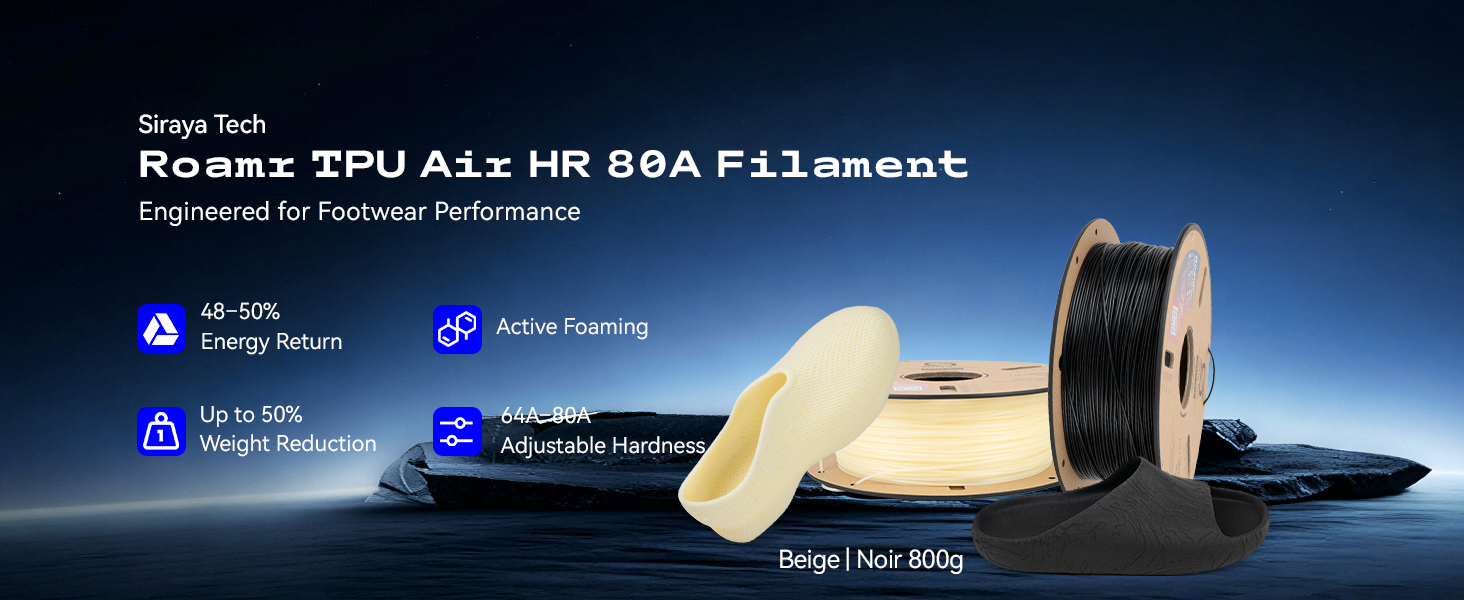 Roamr TPU Air HR 80A is a professional-grade structural foaming filament engineered specifically for footwear comfort and cushioning.