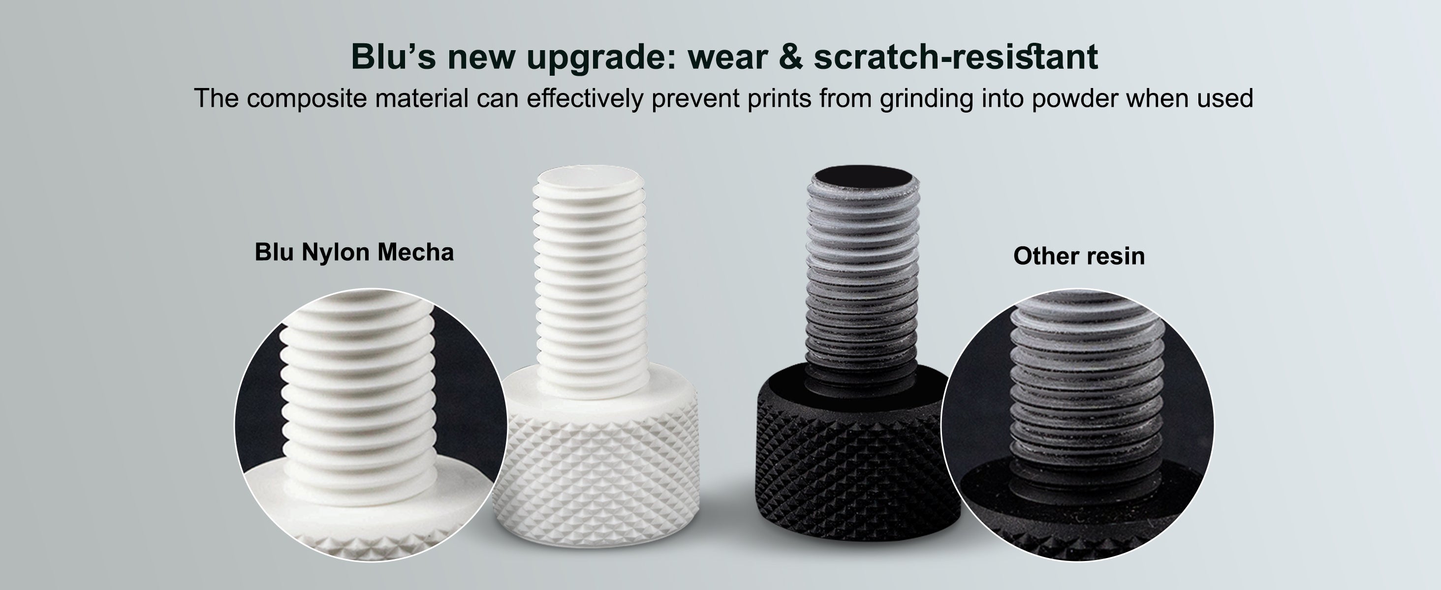 Blu Mecha adds a new composite material that helps the resin reduce powder generated by friction, making the surface smooth and wear-resistant.