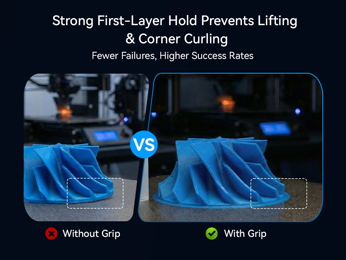 Specifically formulated for PPA, Nylon, ABS, and ASA. Grip provides extreme shear strength during the print, locking down corners of large-scale industrial parts to ensure perfect dimensional accuracy and zero warping.