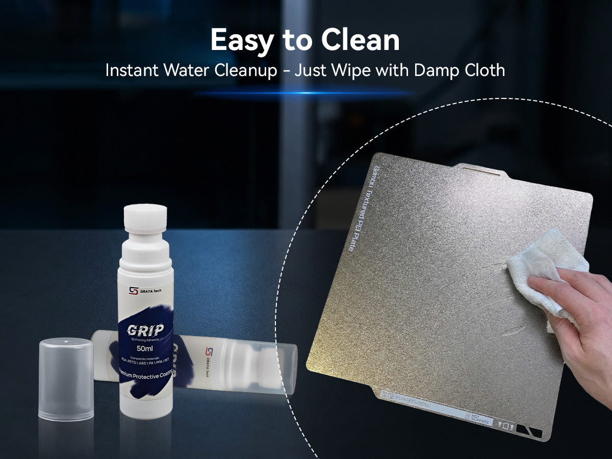 The liquid formula spreads thin and dries invisibly. Unlike glue sticks that leave clumps, Grip leaves no residue and perfectly replicates the texture of your build plate—be it smooth PEI or textured glass—for a professional-grade bottom finish.