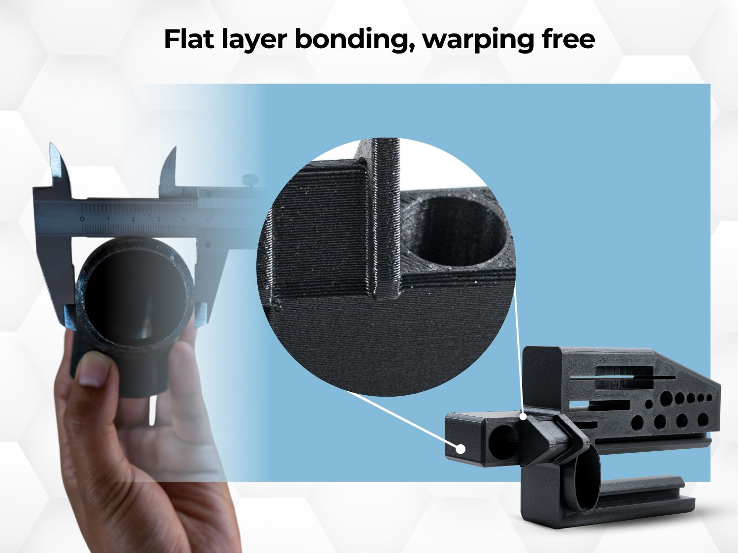 - The carbon fiber reinforcement significantly enhances layer bonding, impact resistance, and stiffness, ensuring greater dimensional stability and accuracy in prints.