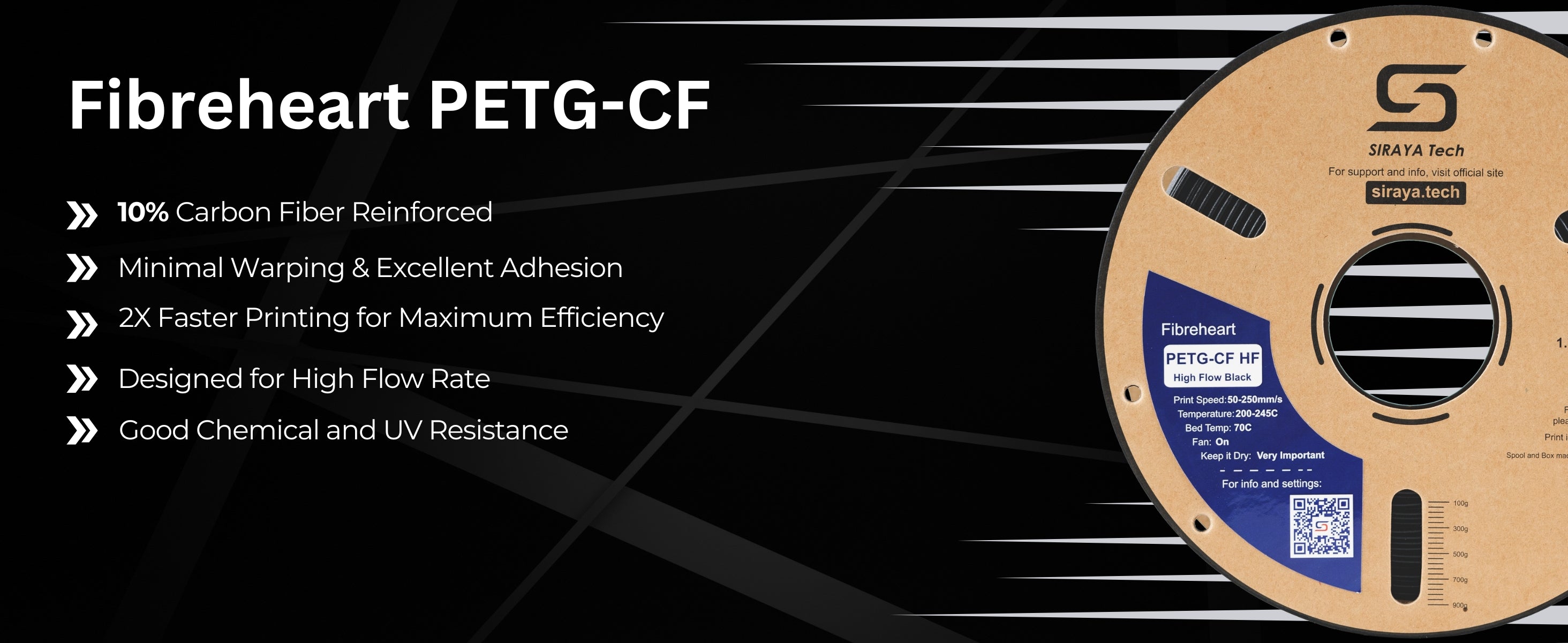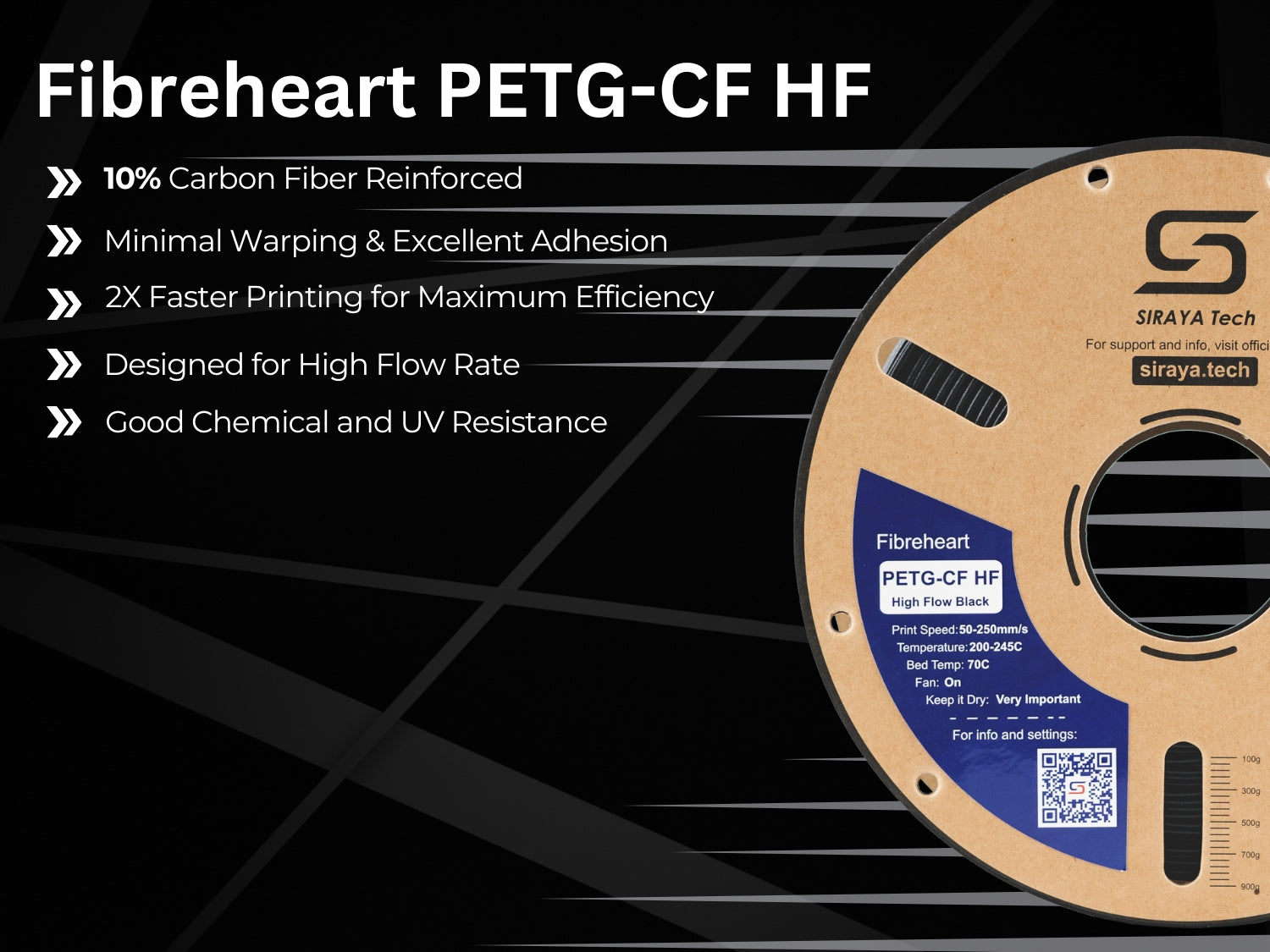 Siraya Tech Fibreheart PETG-CF HF is a high-speed carbon fiber PETG filament.