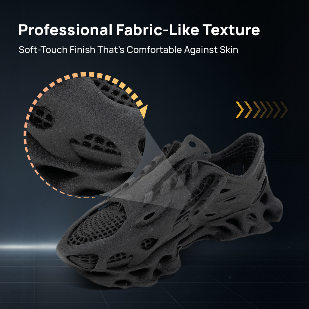 Built for the outdoors. The material is highly resistant to abrasion and repeated compression, bringing 3D printed shoes closer to the durability of mass-market retail footwear.