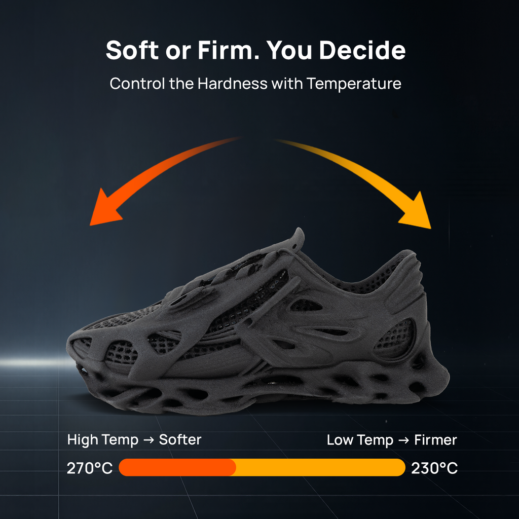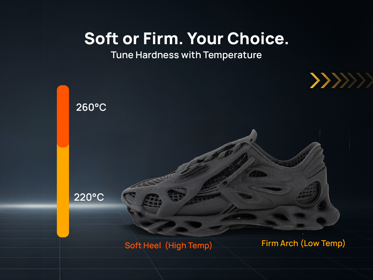Adjust your print temperature to transition from 68A (soft heel impact) to 85A (firm arch support) within the same print.
