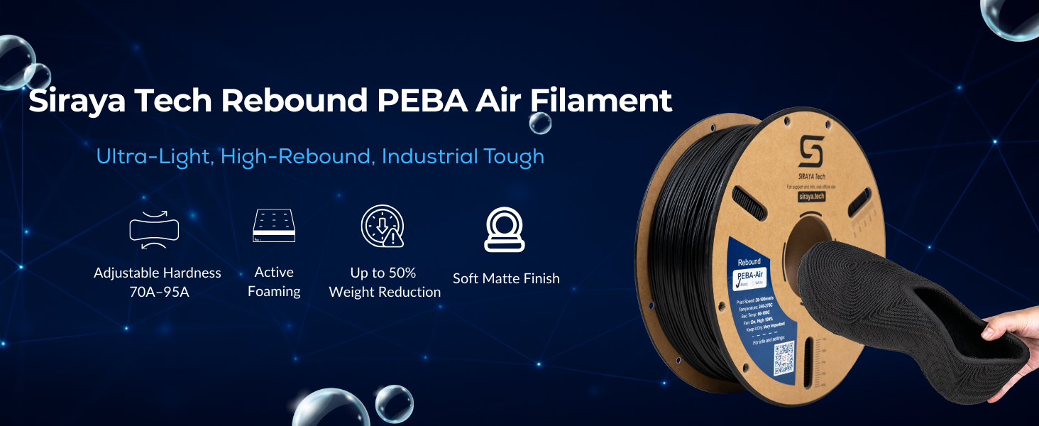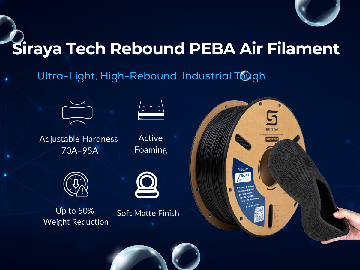 Siraya Tech PEBA Air is a groundbreaking foaming elastomer filament that lets you control softness (70A-95A) and density by adjusting the print temperature.